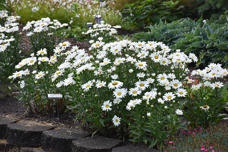 A delightful variety of the ever-popular shasta daisy; numerous beautiful white double blooms with yellow eyes rise above and graciously contrast the deep green glossy foliage; a wonderful choice to mass as a garden focal point