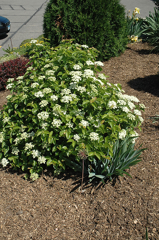 A compact garden shrub covered in showy flat-topped clusters of creamy white flowers in late spring followed by striking blue berries, attractive to birds, reliable fall color; a rugged and adaptable shrub, ideal for the garden or as a natural hedge