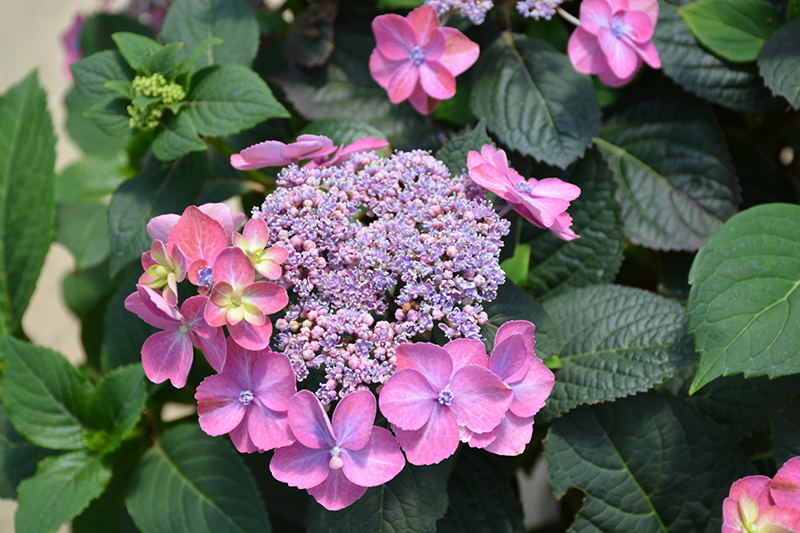 Tuff Stuff™ Hydrangea features bold pink lacecap flowers with white overtones and creamy white centers at the ends of the branches from early to late summer. The flowers are excellent for cutting. It has attractive dark green deciduous foliage. The serrated pointy leaves are highly ornamental and turn an outstanding burgundy in the fall.