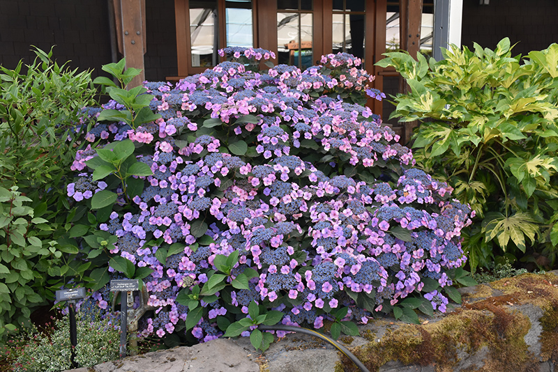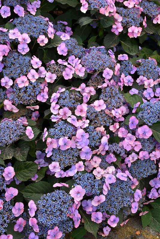An attractive, re-blooming shrub featuring showy white to light-pink lacecap flowers with creamy centers, that turn more blue in acid soil; re-blooms on new and old wood; deep green leaves turn burgundy in fall
