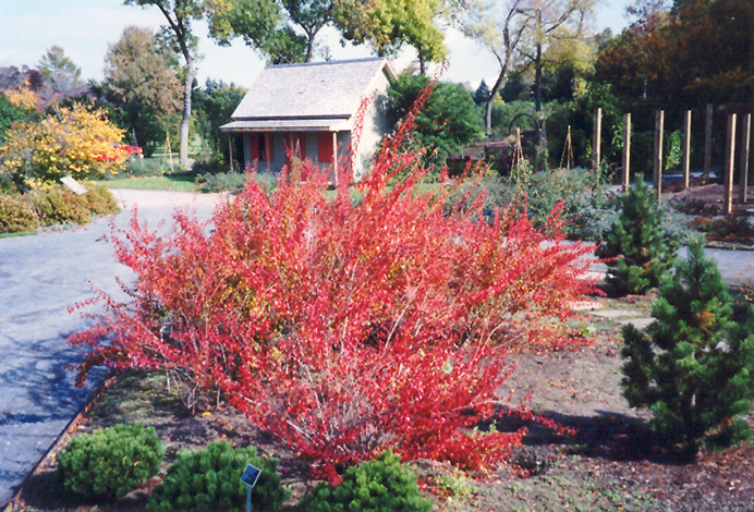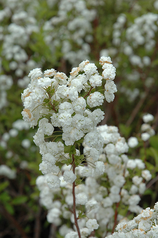 An heirloom shrub which is smothered in double white flowers along the wiry branches in early spring; presents good fall color; a rather shrubby growth habit, with upright stems that are quite leggy; needs underplanting and regular pruning