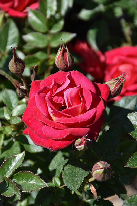 Exciting deep pink blooms emerge from red buds, and each petal has a touch of luminous yellow at the base; dark green foliage provides excellent contrast; great for smaller garden areas, containers, or as groundcover