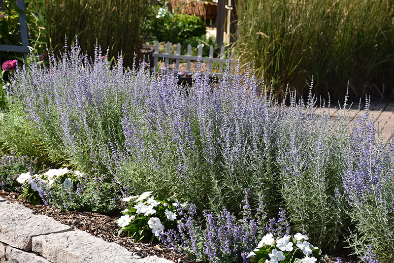 Denim 'n Lace Russian Sage features delicate spikes of lavender flowers with blue overtones rising above the foliage from mid summer to mid fall. The flowers are excellent for cutting. Its attractive fragrant narrow leaves emerge silver in spring, turning grayish green in color throughout the season.