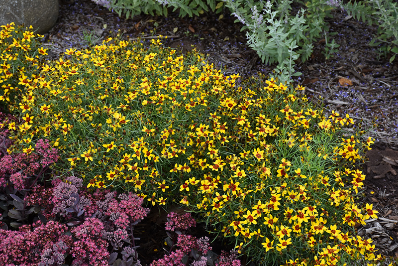 Sizzle And Spice® Curry Up Tickseed is smothered in stunning yellow daisy flowers with dark red eyes at the ends of the stems from early to late summer. The flowers are excellent for cutting. Its threadlike leaves remain emerald green in color throughout the season.