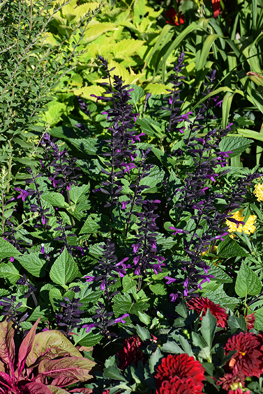 A uniform, well branched salvia producing numerous black spikes covered in vibrant purple blooms; a beautiful addition to borders or beds with its dense and bushy form; looks fantastic in containers