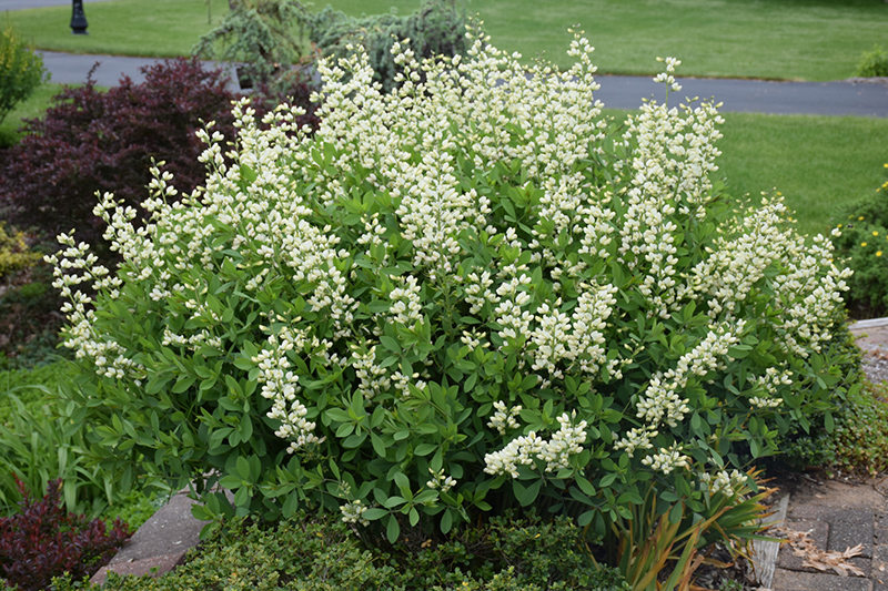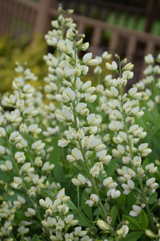 Decadence® Vanilla Cream False Indigo has masses of beautiful spikes of creamy white pea-like flowers rising above the foliage from late spring to early summer, which emerge from distinctive buttery yellow flower buds, and which are most effective when planted in groupings. The flowers are excellent for cutting. Its oval leaves emerge coppery-bronze in spring, turning grayish green in color throughout the season. The fruits are showy black pods displayed in late summer.