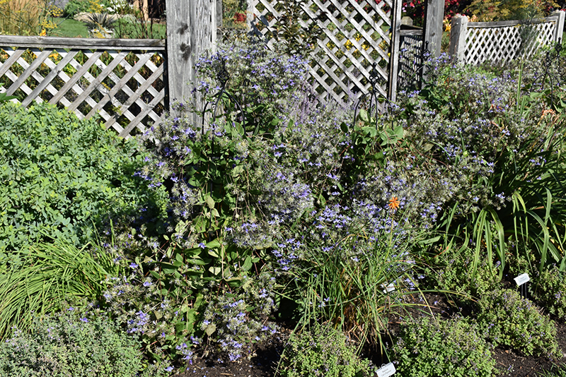 Stand By Me Bush Clematis features delicate nodding blue star-shaped flowers with creamy white eyes at the ends of the branches from late spring to late summer, which emerge from distinctive deep purple flower buds. It has green deciduous foliage. The compound leaves do not develop any appreciable fall color.