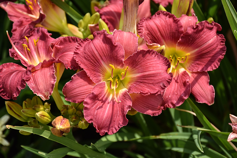 Pretty, ruffled red trumpets with yellow throats and pale orange flares; provides a bold contrast to other plants; sturdy, strong, easy to care for, great grassy texture and form; a stunning display when massed in the garden