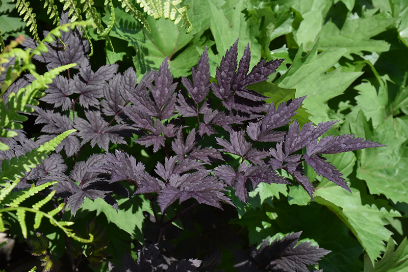 Whimsical spikes of light pink flowers hover above highly contrasting dark purple foliage on this striking variety that is perfect for the back of borders; likes to be consistently moist and prefers partial shade