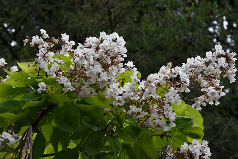 A medium sized shade tree with enormous leaves resulting in a very coarse texture, use where this is required; large clusters of showy white, orchid-like flowers in early summer and long narrow bean-pod shaped fruit in fall are very ornamental