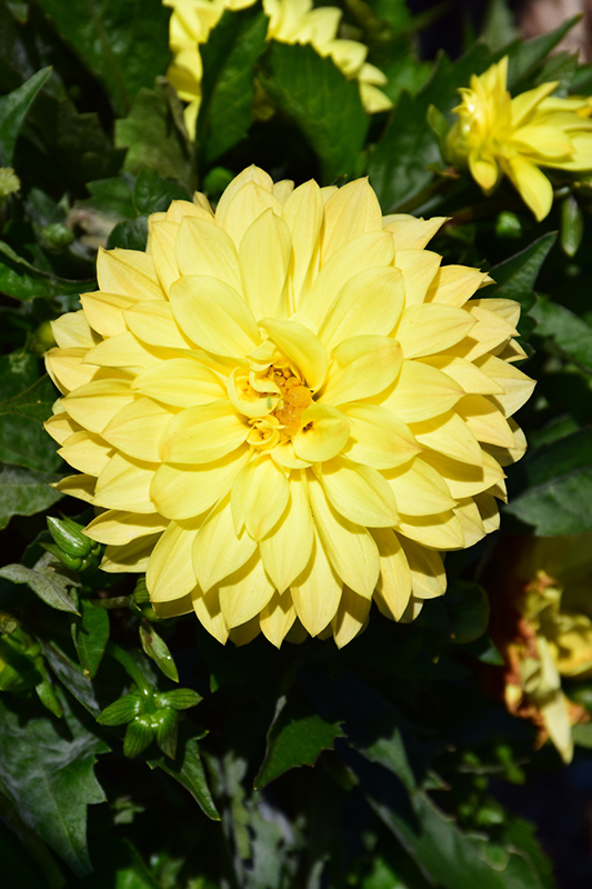 Hypnotica Yellow Dahlia features showy double yellow daisy flowers at the ends of the stems from mid spring to early fall. The flowers are excellent for cutting. Its serrated pointy leaves remain dark green in color throughout the season.
