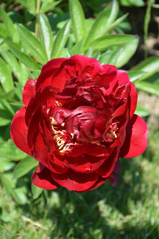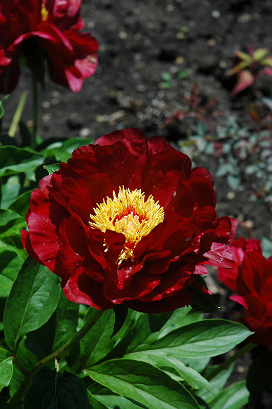 Buckeye Belle Peony features bold lightly-scented semi-double dark red flowers with yellow anthers at the ends of the stems from late spring to early summer. The flowers are excellent for cutting. Its compound leaves remain green in color throughout the season.