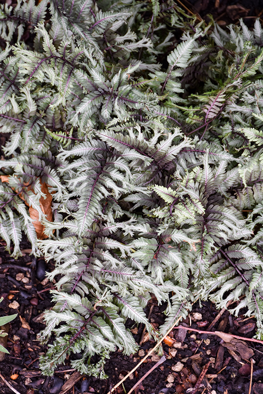 Crested Surf Japanese Painted Fern is primarily valued in the garden for its cascading habit of growth. Its attractive ferny bipinnately compound leaves emerge deep purple in spring, turning grayish green in color with showy white variegation and tinges of silver throughout the season. The burgundy stems are very colorful and add to the overall interest of the plant.