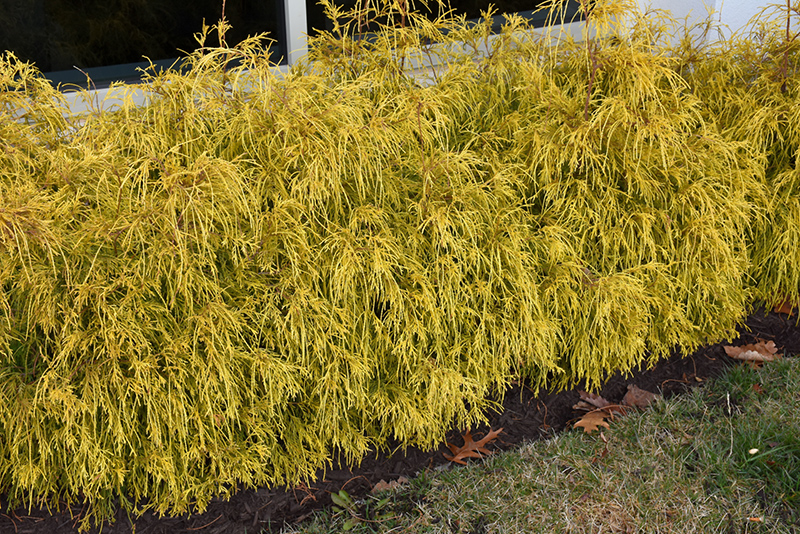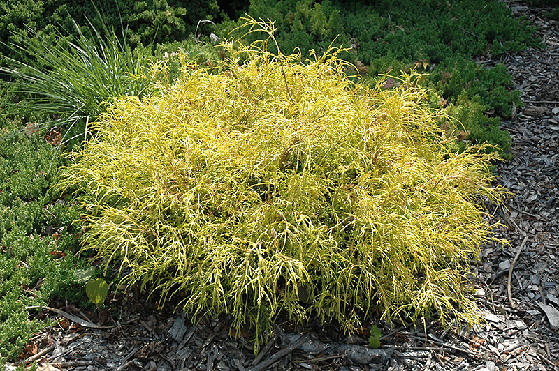 A beautiful landscape evergreen with sprays of fine threadlike leaves that emerge a bright gold and hold their yellow color well into the heat of summer, forms a compact haystack shape over the years, an excellent color accent shrub for the garden