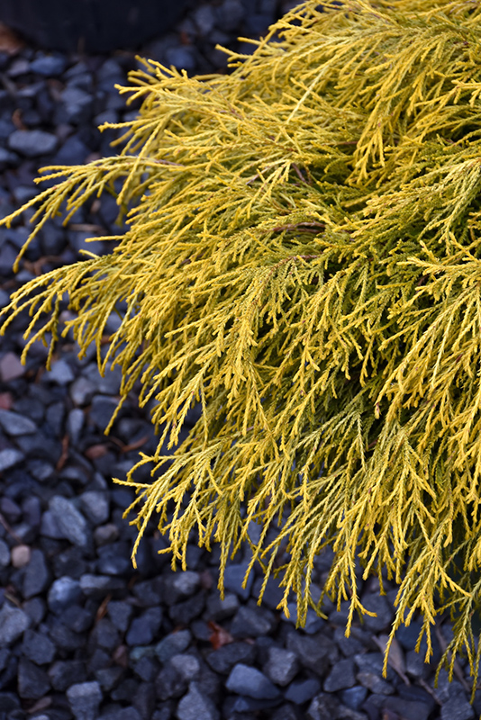 Golden Charm Falsecypress is a dwarf conifer which is primarily valued in the landscape or garden for its distinctively pyramidal habit of growth. It has attractive gold evergreen foliage. The threadlike sprays of foliage are highly ornamental and turn yellow in the fall, which persists throughout the winter.