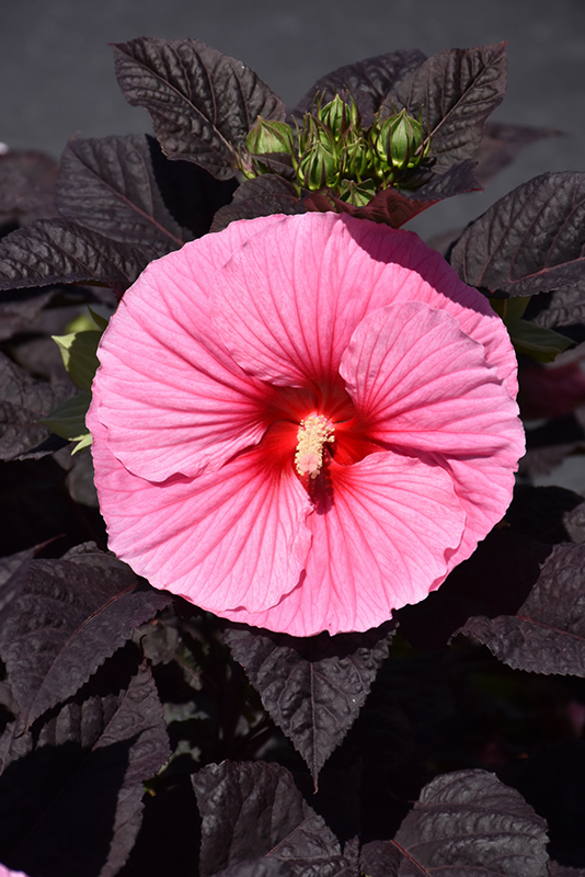Summerific® Edge of Night Hibiscus features bold pink round flowers with hot pink veins at the ends of the stems from mid summer to early fall. Its large glossy pointy leaves remain deep purple in color with hints of black throughout the season.