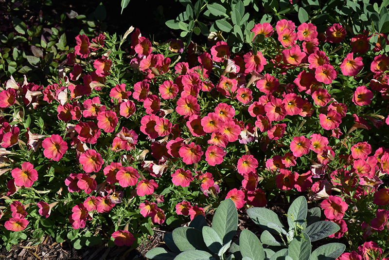 Supertunia® Persimmon Petunia is covered in stunning coral-pink trumpet-shaped flowers with orange overtones and yellow centers at the ends of the stems from mid spring to mid fall. Its pointy leaves remain green in color throughout the season.