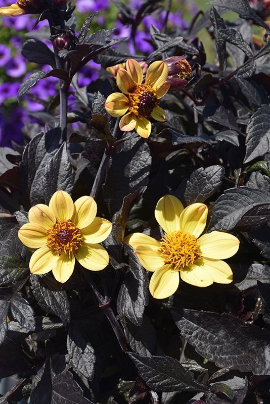 Happy Days™ Yellow Dahlia features showy yellow daisy flowers with dark brown eyes and gold anthers at the ends of the stems from mid spring to early fall. The flowers are excellent for cutting. Its attractive serrated pointy leaves remain black in color with showy dark green variegation throughout the season. The dark red stems can be quite attractive.