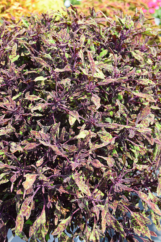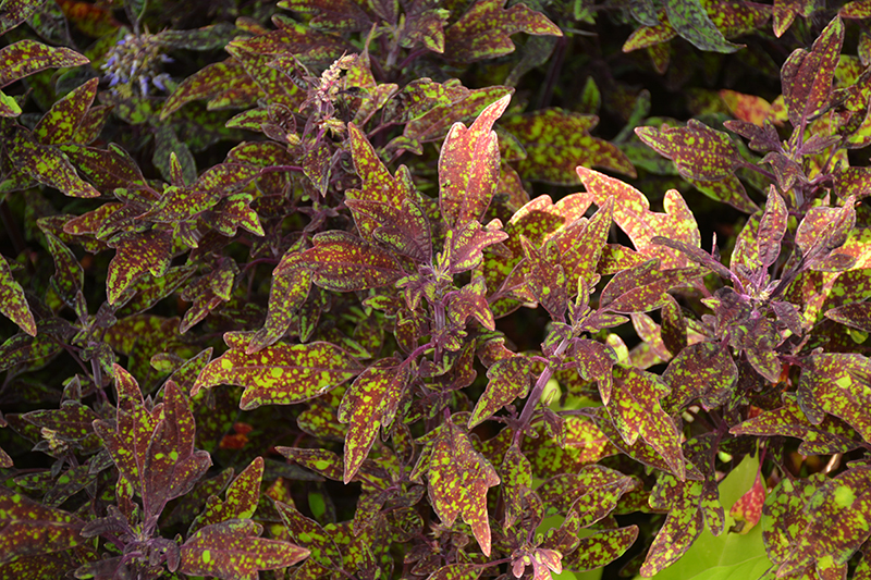 Down Town™ NYC Nights Coleus' attractive serrated narrow leaves remain burgundy in color with distinctive lime green spots and tinges of coppery-bronze throughout the season on a plant with an upright spreading habit of growth.