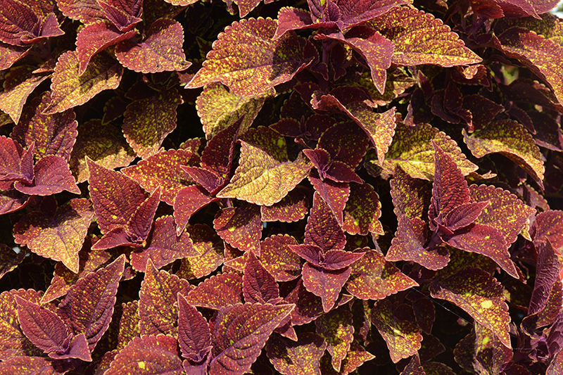 This colorful selection presents brick red leaves marked with contrasting gold spots and copper overtones; great for sun or shade, with a tidy, upright mounded habit; late flowering; perfect for gardens, containers, hanging baskets and mixed borders