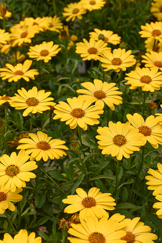 Serenity™ Deep Yellow African Daisy is covered in stunning yellow daisy flowers with gold overtones and dark brown centers at the ends of the stems from mid spring to early fall. The flowers are excellent for cutting. Its narrow leaves remain green in color throughout the season.