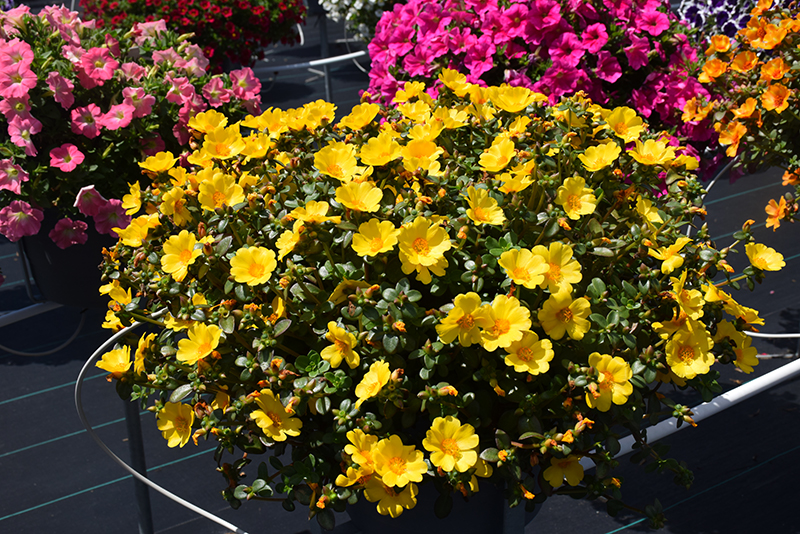 Mega Pazzaz™ Gold Portulaca features showy yellow cup-shaped flowers with gold eyes at the ends of the stems from late spring to early fall. Its tiny succulent oval leaves remain green in color throughout the season.