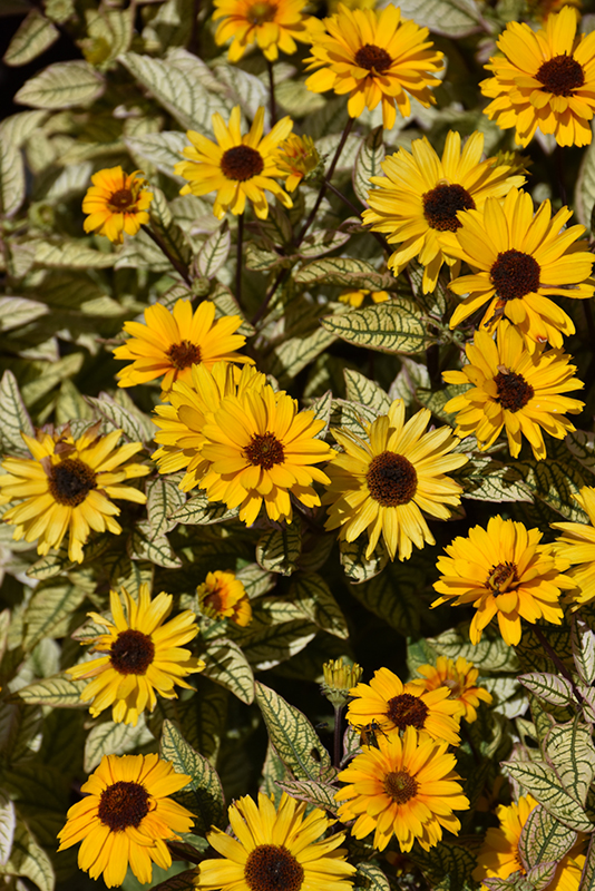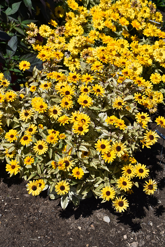 Compact form, bright, beautiful golden-yellow blooms over spectacular variegated foliage; pink tones appear on new foliage; low maintenance and beneficial to pollinators; leave standing over winter so songbirds can feast on the seeds; heat tolerant