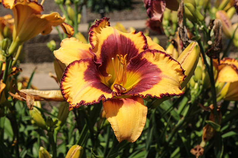 Reblooming and fragrant, this variety produces large, golden yellow blooms with burgundy eyes and picotee edges; sturdy, strong, easy to care for, great grassy texture and form; good for the beginner gardener and the pro; tetraploid