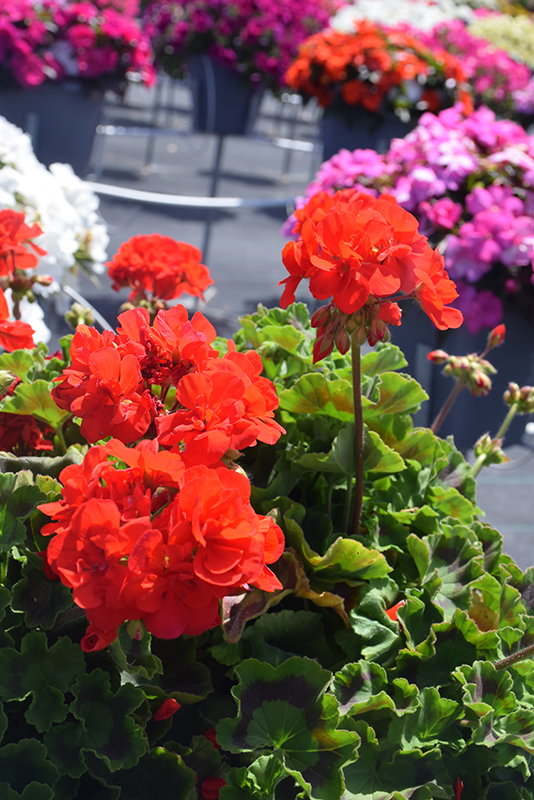 Calliope® Medium Scarlet Geranium features bold balls of scarlet flowers at the ends of the stems from late spring to early fall. The flowers are excellent for cutting. Its tomentose round palmate leaves remain green in color throughout the year.