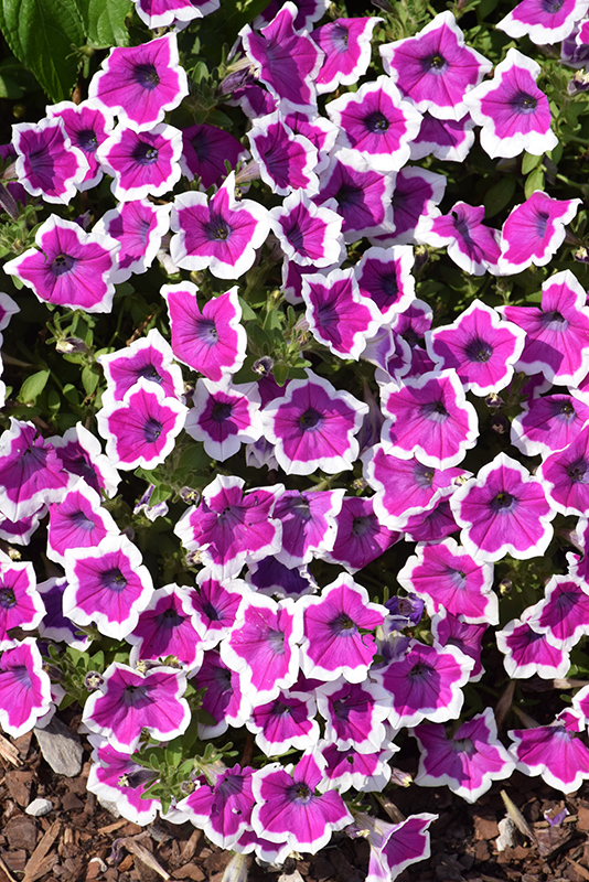 Supertunia® Hoopla® Vivid Orchid™ Petunia is smothered in stunning fuchsia trumpet-shaped flowers with purple throats and white edges at the ends of the stems from mid spring to mid fall. Its pointy leaves remain green in color throughout the season.
