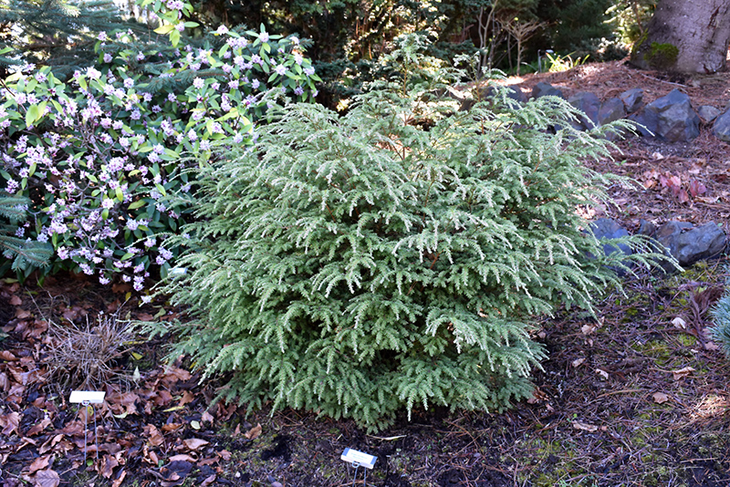 Moon Frost Hemlock will grow to be about 3 feet tall at maturity, with a spread of 3 feet. It tends to fill out right to the ground and therefore doesn't necessarily require facer plants in front. It grows at a slow rate, and under ideal conditions can be expected to live for 40 years or more.