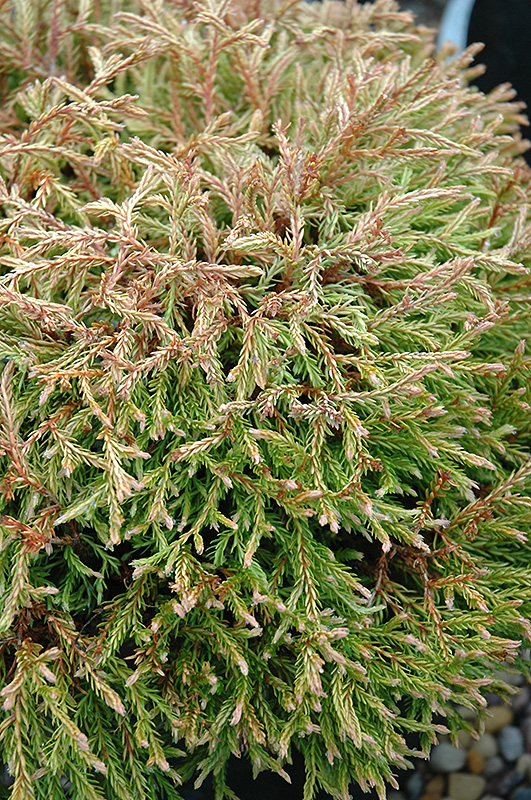 An attractive pillow shaped golden orange shrub that creates an interesting focal point for borders or groupings; very slow growing and full sun brings out its best features