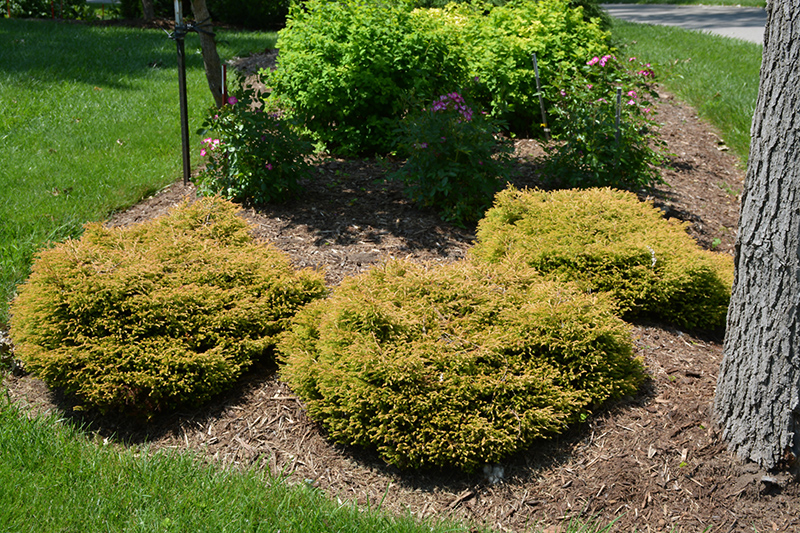Golden Tuffet Arborvitae is a dwarf conifer which is primarily valued in the garden for its interestingly mounded form. It has attractive gold foliage with hints of lime green which emerges yellow in spring. The threadlike sprays of foliage are highly ornamental and remain gold throughout the winter.