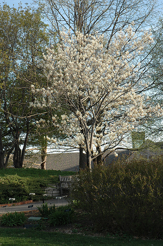 Cumulus Serviceberry will grow to be about 10 feet tall at maturity, with a spread of 8 feet. It has a low canopy with a typical clearance of 2 feet from the ground, and is suitable for planting under power lines. It grows at a medium rate, and under ideal conditions can be expected to live for 40 years or more. While it is considered to be somewhat self-pollinating, it tends to set heavier quantities of fruit with a different variety of the same species growing nearby.