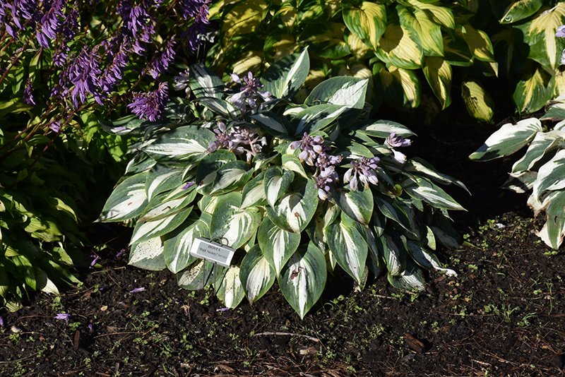 High Society Hosta features dainty spikes of lavender tubular flowers rising above the foliage from mid to late summer. Its attractive small textured oval leaves remain white in color with showy bluish-green variegation throughout the season.