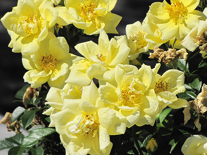 Masses of yellow blossoms with cream centers are presented on this true easy care groundcover rose; simple to grow and easy to maintain with no spraying; cut back to one third in late winter