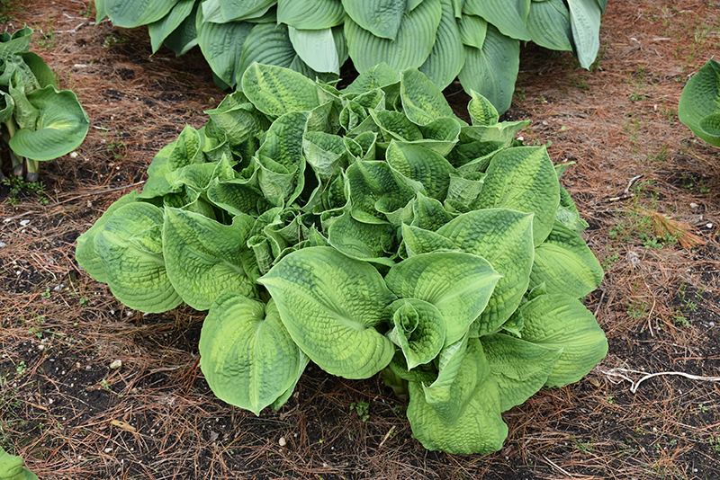 This moderately fast growing variety has beautiful heart shaped corrugated leaves with a bright yellow center and two-tone green margins; provides beautiful texture and contrast to other plants; near-white spikes of flowers in late spring or early summer
